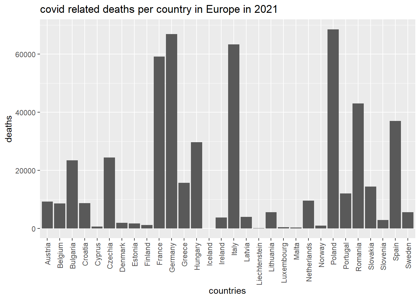 country_deaths <- covid_data %>% group_by(countriesAndTerritories) %>% filter(year == params$year, continentExp == params$continent) %>% summarize(deaths = sum(deaths, na.rm = TRUE))